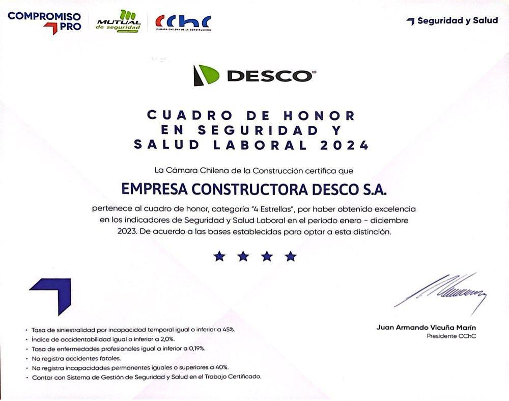 😀 Felices y orgullosos de pertenercer al cuadro de honor de la Cámara Chilena de la Construcción, en esta oportunidad, en la categoría 4 estrellas, este reconocimiento se otorga a quienes con su liderazgo y compromiso, fortalecen la cultura de Seguridad y Salud Laboral en sus empresas, se anticipan a los peligros para eliminar o mitigar los riesgos, operan con altos estándares y no transan cuando se trata de la seguridad de sus trabajadores.